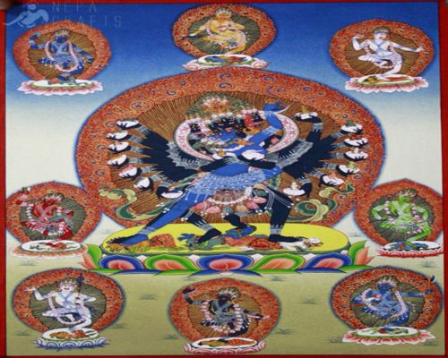 Dominando o centro do quadro é Mahottara Heruka, que é irado, na cor marrom, com três triple-eyed faces, seis braços, Vajra-asas, e está em união sexual com sua consorte azul em meio a uma massa ardente de fogo de sabedoria. Em frente Mahottara é um ardente taça de crânio que contém a “oferta irada dos cinco órgãos dos sentidos” (olhos, ouvidos, nariz, língua e coração). Por trás dessas ofertas sensoriais é um ‘bolo sacrificial “torma ou triangular, que emana chamas e luz arco-íris. E para o canto inferior esquerdo e direito do crânio central são dois pequenos crânio-copos montado em crânio-tripés, que contêm um coração e olhos, e as ‘cinco grandes’ proibidos carnes (vaca, elefante, cavalo, macaco, cachorro e) . Ao redor do trono Mahottara de lótus são o matarah oito ou ‘mães’. Essas deusas coléricas são dois braços e com cabeça humana, e dançam em meio a nuvens e ventos que prendem seus vários atributos e armas.