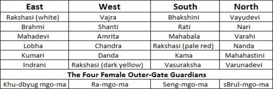 Esses “guardiões dos quatro portões da Mandala ‘, aka’ os quatro Gate Keepers feminino”, aparecem no dia 6 do bardo (não confundir com os quatro Vajra-guardiões que aparecem no 12 º dia).